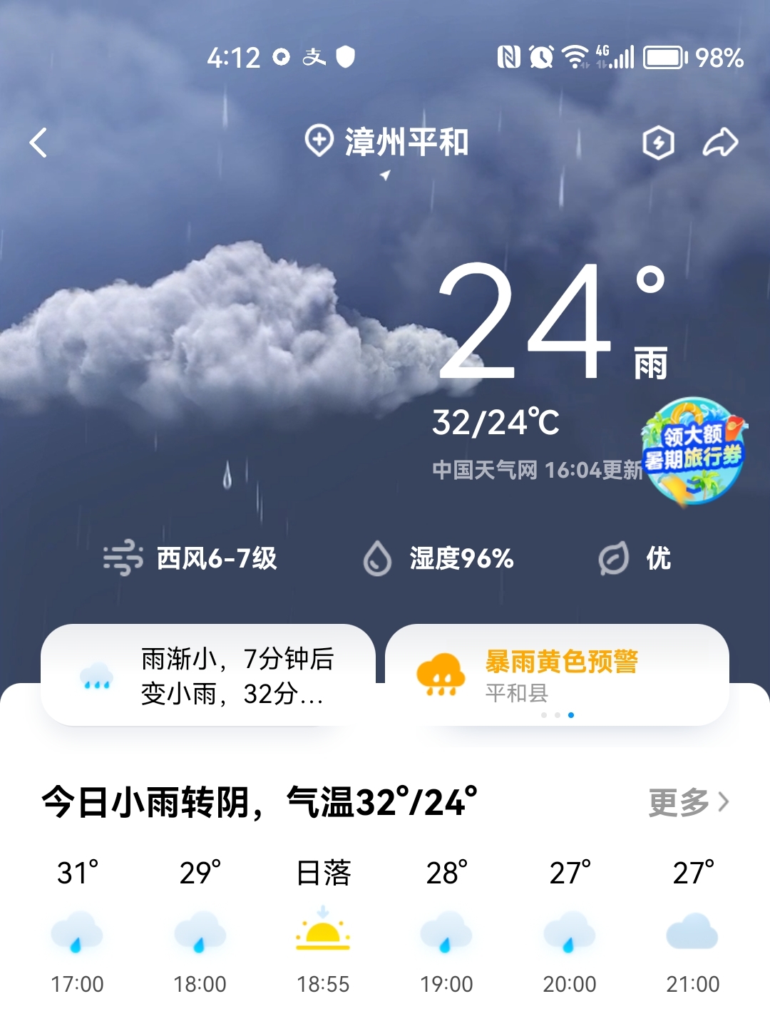 32/24不时的来场小雨,这天气刚刚好,又不需要开空调。